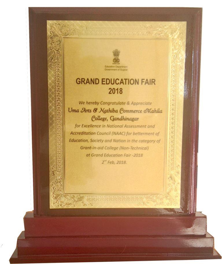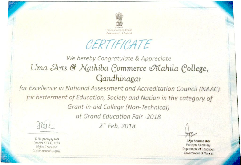 Uma Arts and Nathiba Commerce Mahila College has been awarded for Excellence in National Assessment and Accreditation Council (NAAC) Category of Grant in Aid College (Non Technical) by Education Department, Government of Gujarat at Grand Education Fair 2018 on 2nd Feb 2018